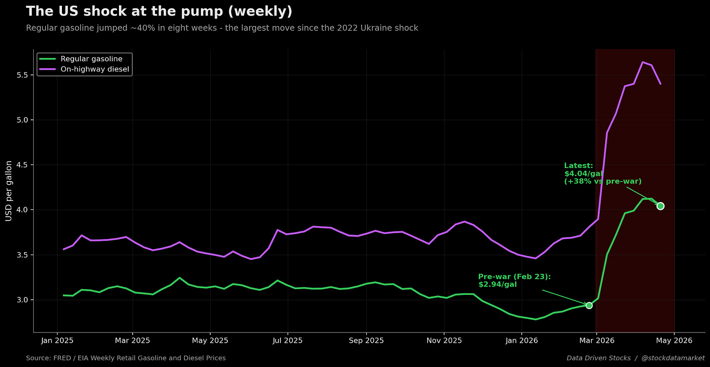 For most readers, the abstract barrel-of-oil number doesn’t matter. What matters is the price on the gas-station sign. The U.S. story so far is straightforward and ugly.