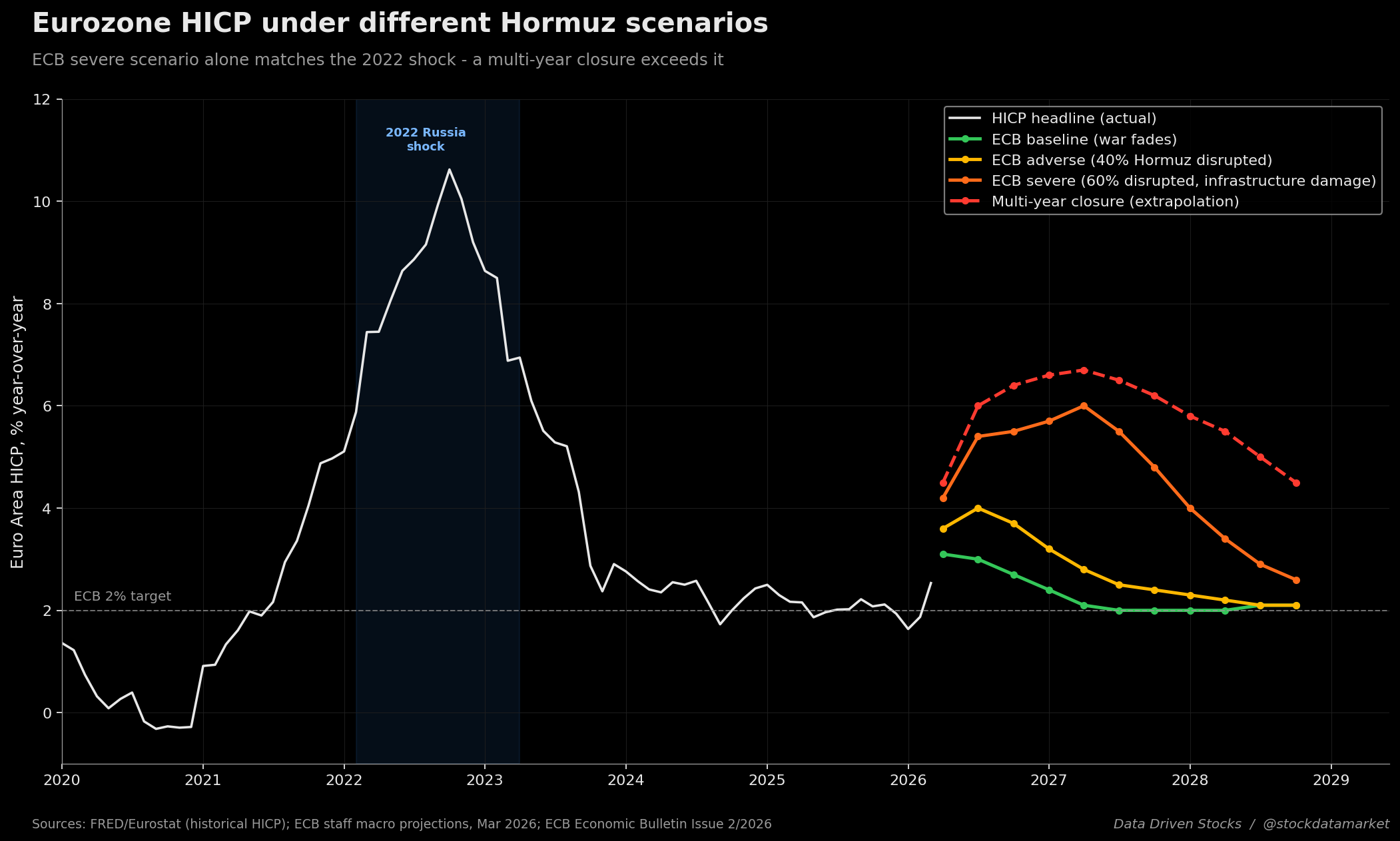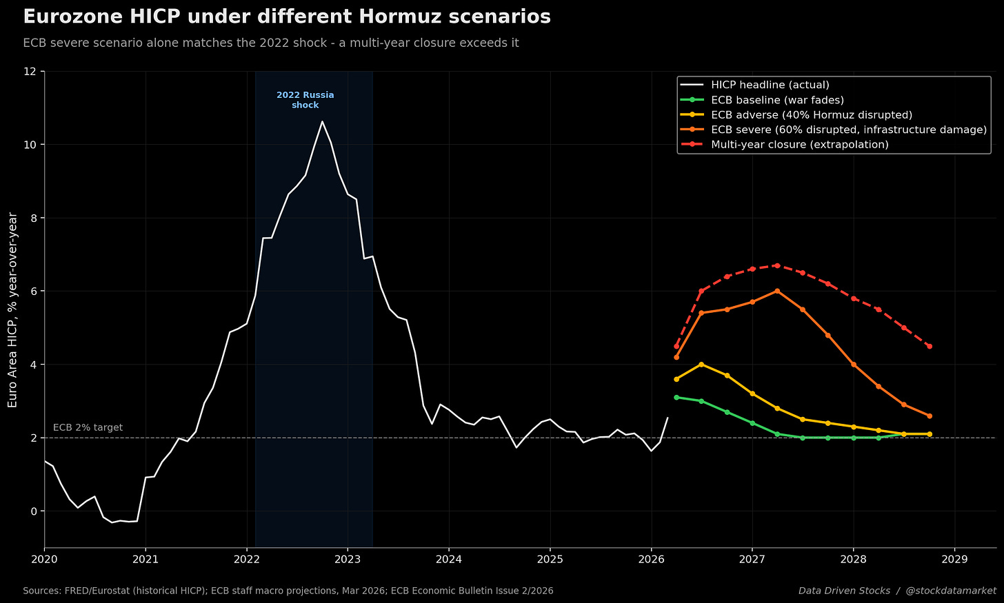 Numerically: the ECB baseline already lifts 2026 HICP to 2.6% (from 1.9% pre-war). The adverse scenario peaks above 3.5% in 2026 and stays above target into 2027. The severe scenario adds 1.8 percentage points of inflation in 2026, 2.8 percentage points in 2027, and 0.7 percentage points in 2028 above baseline - meaning HICP around 4.4% in 2026 and 4.8% in 2027. The shape of that profile is what matters. The peak is in 2027, not 2026, which is the textbook signature of a shock that has migrated from energy into wages, services, and core. That is a regime change, not a spike. A multi-year closure pushes the trajectory higher and longer, with HICP staying above 5% well into 2028.