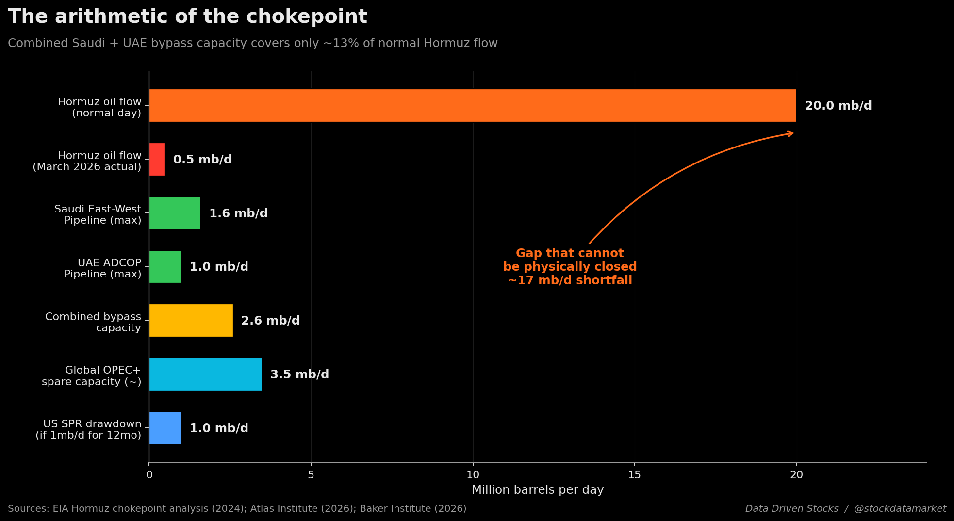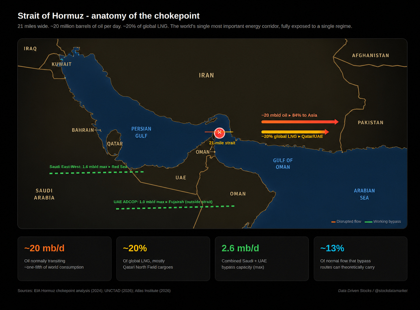 The thing that makes Hormuz uniquely dangerous is that the alternatives are tiny. The Saudi East-West Pipeline can move about 1.6 million barrels per day to the Red Sea. The UAE’s Abu Dhabi Crude Oil Pipeline can move about 1.0 million barrels per day to Fujairah, outside the strait. That is 2.6 million barrels per day combined - against roughly 20 million barrels per day of normal flow. Iraq, Kuwait, Qatar, and Bahrain have no comparable bypass at all. For LNG, there are no alternatives whatsoever; Qatar and the UAE simply cannot ship a meaningful share of their exports through any other route.