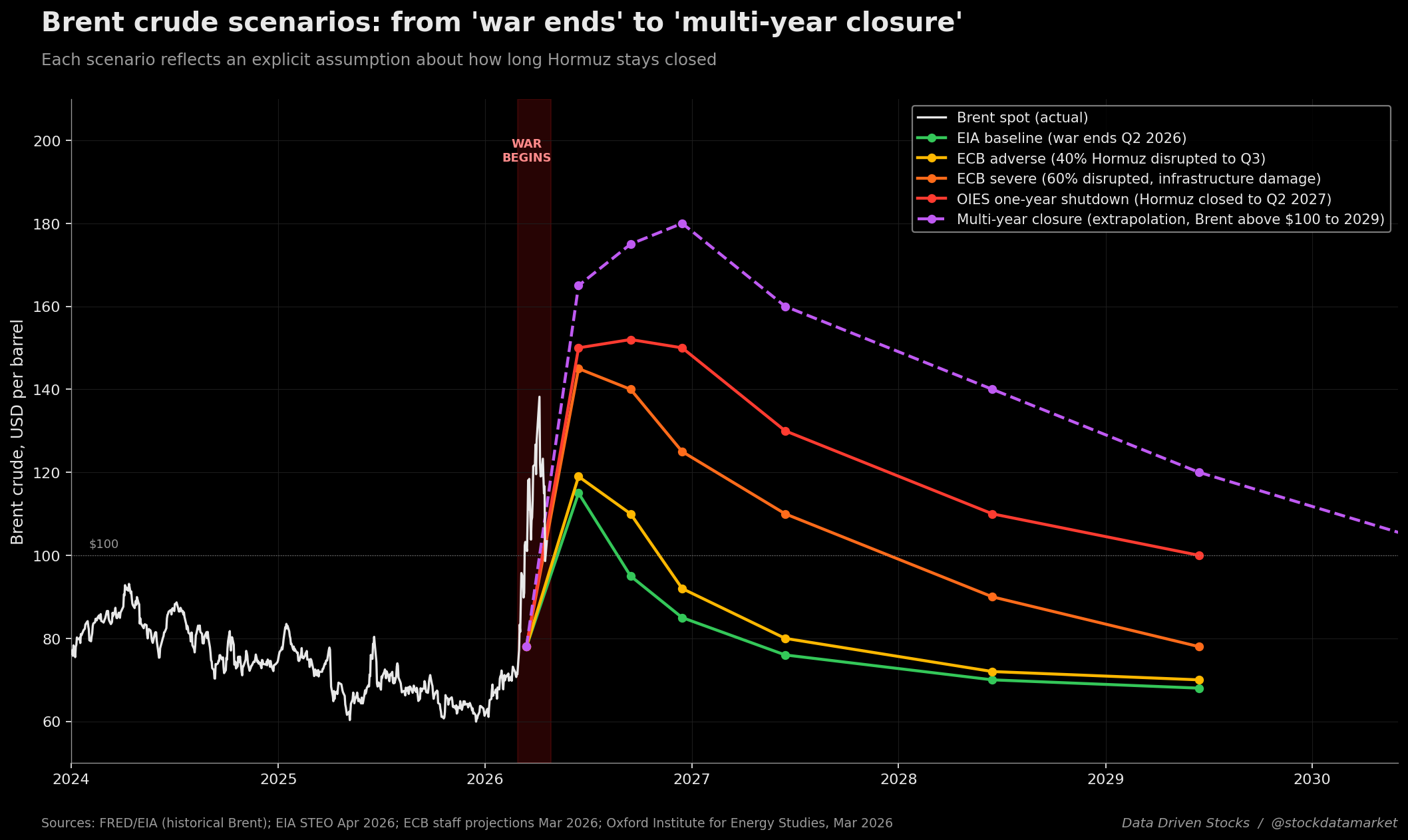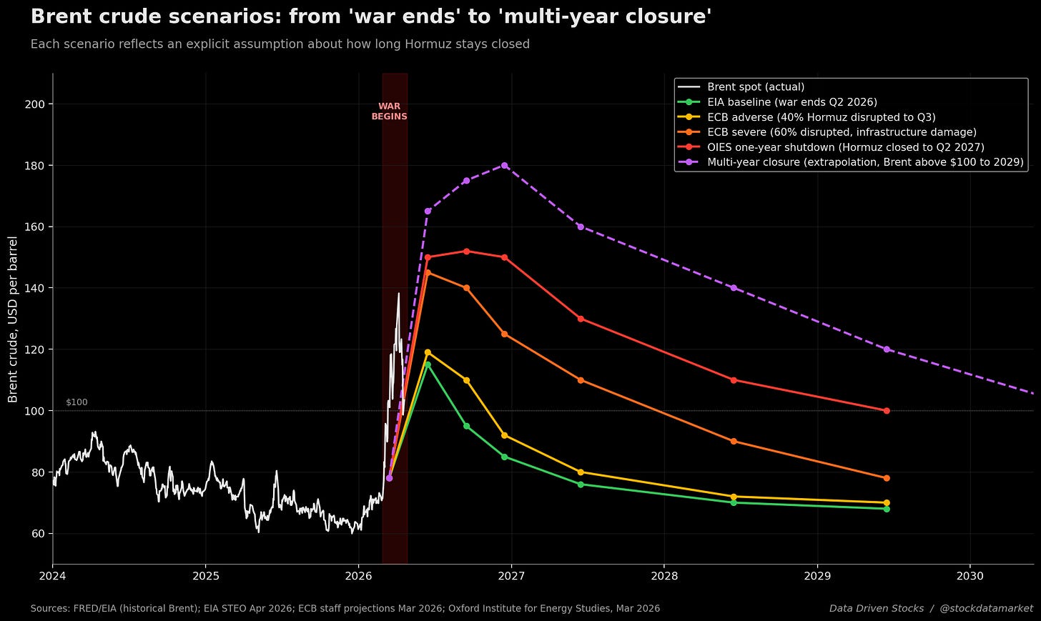 Public scenario work from the EIA, the ECB, and the Oxford Institute for Energy Studies - the most credible institutions modelling this in real time - lines up surprisingly well, even though they use different models and assumptions. What they disagree on is duration, and that disagreement is the entire forecast. Below is what each of those scenarios implies for Brent crude through 2030, with the historical Brent price plotted in white for context.