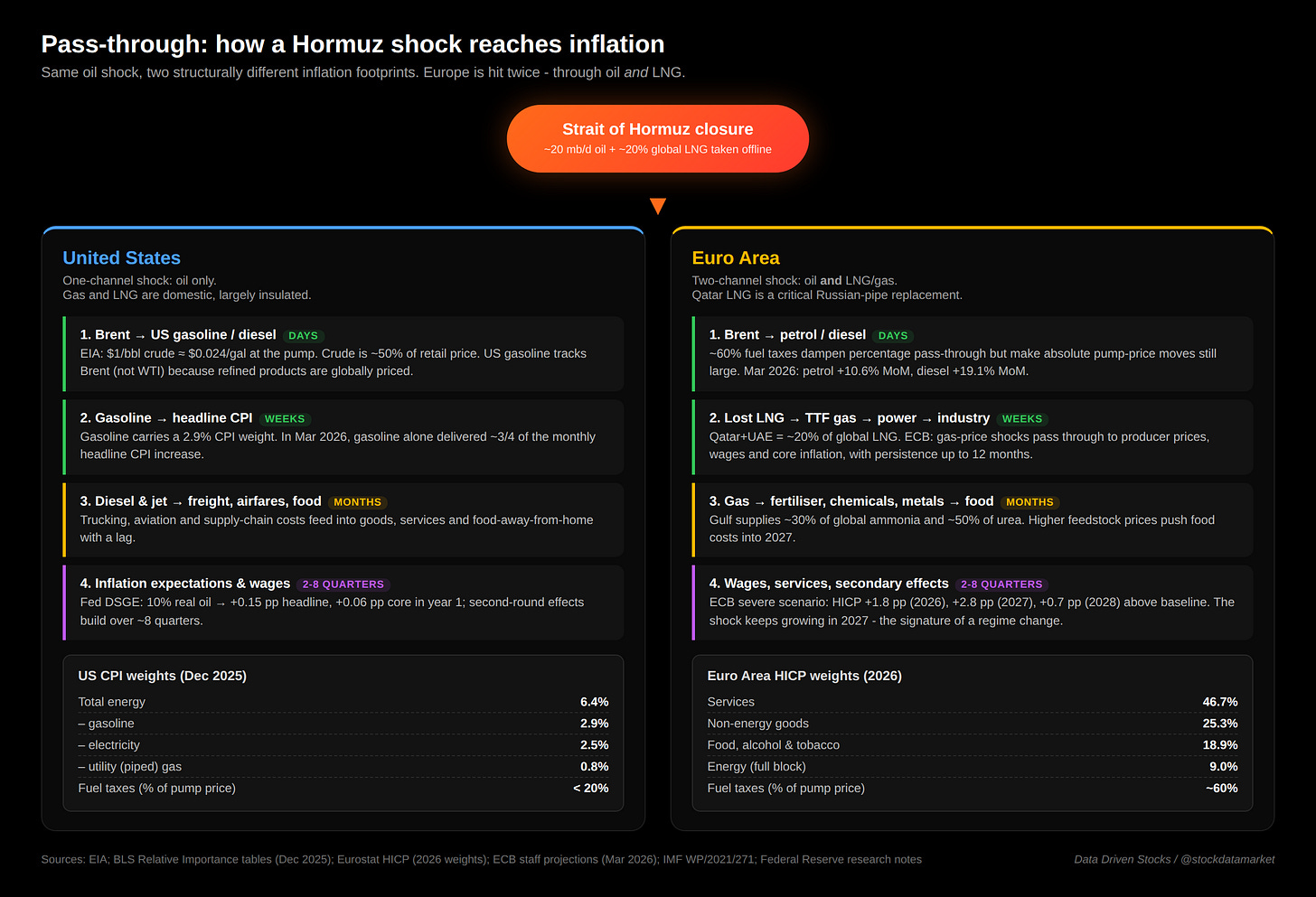 In the Eurozone, the energy block is only 9% of the HICP basket - structurally smaller than in the U.S. - but the second-round risk is much larger because the LNG channel is real. Qatar and the UAE supply about 20% of global LNG, mostly to Asia, but in a cut-off Europe has to compete in a tighter global market for the marginal cargo. That moves the Dutch TTF benchmark, then European wholesale electricity (where gas is the marginal price-setter), then industrial input costs (especially fertiliser, where the Gulf supplies roughly 30% of global ammonia and 50% of urea), and finally food and manufactured goods. The ECB explicitly says energy-supply shocks pass through more strongly when inflation is already high, and that gas-price shocks have persistence up to 12 months. The fuel-tax structure also matters: IMF research finds taxes are about 60% of EU pump prices versus less than 20% in the U.S., which damps percentage pass-through but does not stop the shock from reaching the broader basket via electricity, fertiliser, and food.