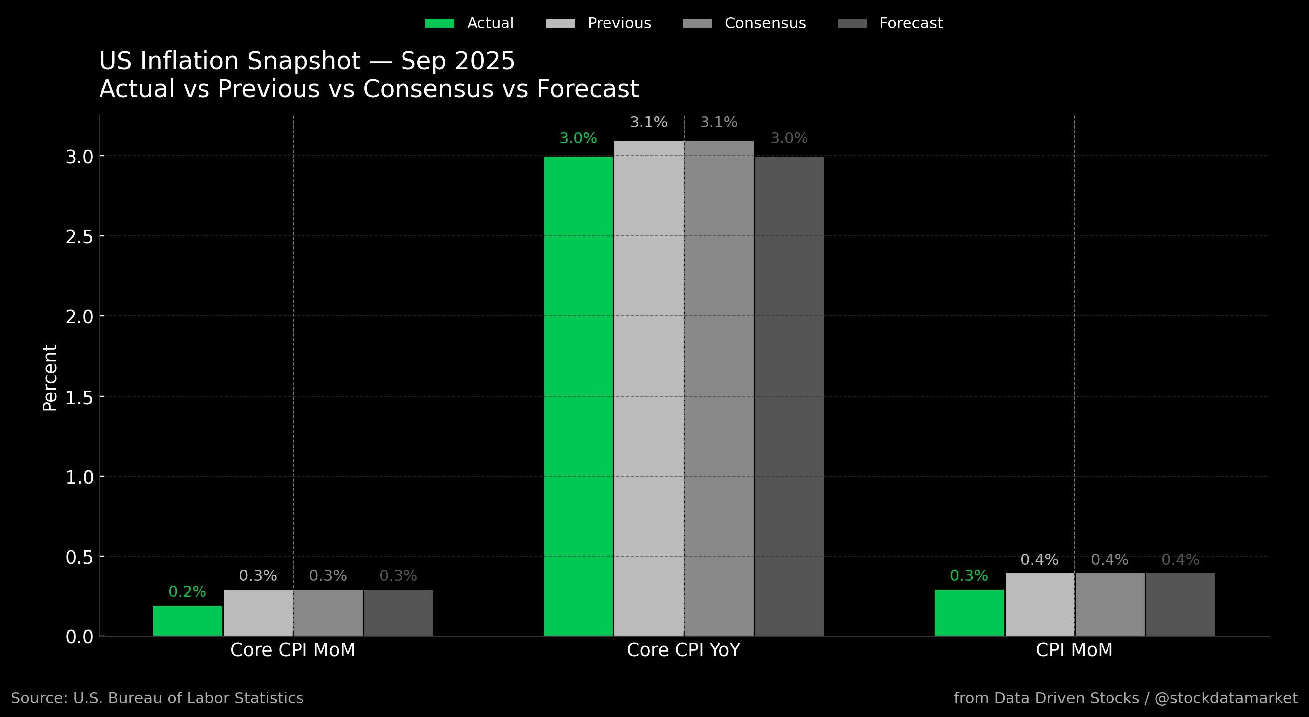 September 2025 CPI snapshot. Headline CPI rose 3.0% year over year and 0.3% month over month; Core CPI slowed to 3.0% year over year and 0.2% month over month, undershooting consensus by a tenth. Sou…
