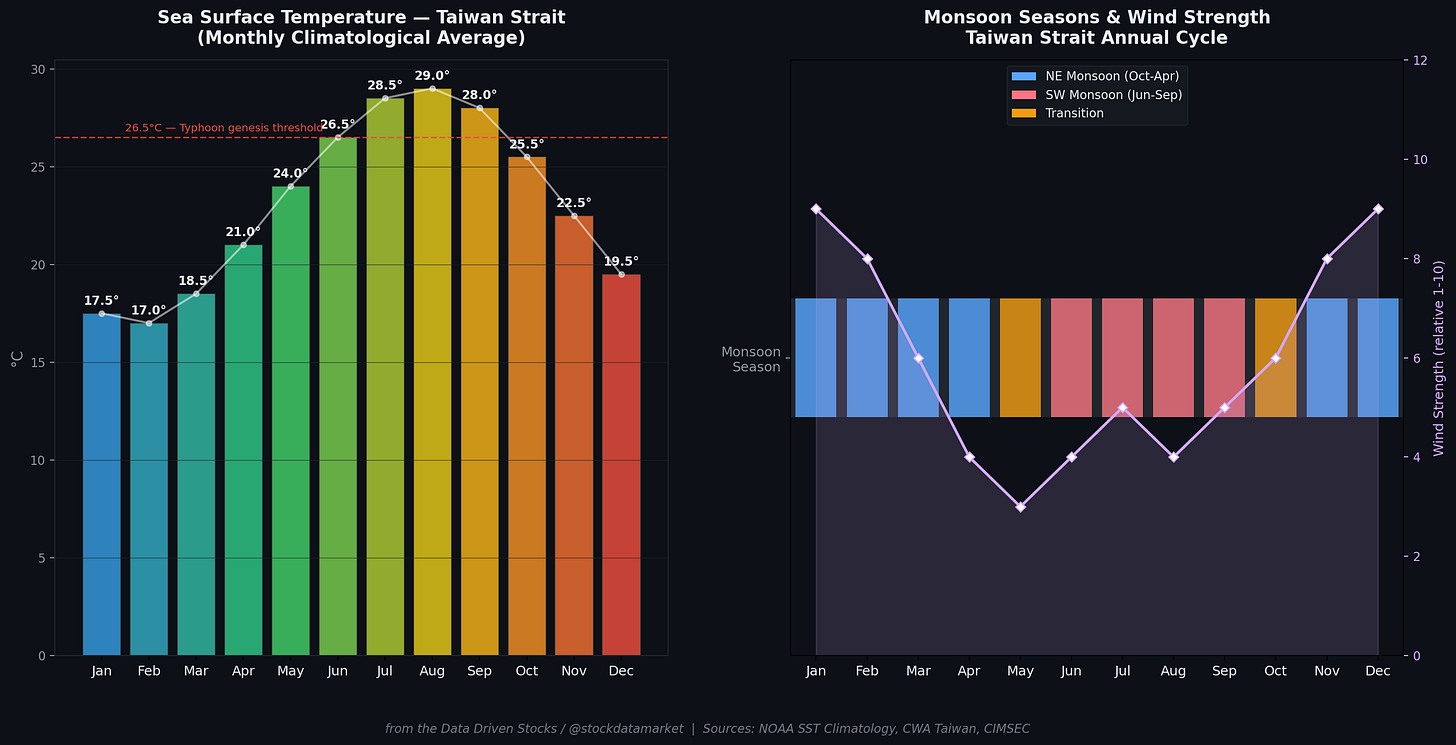 For investors monitoring Taiwan Strait tensions, this seasonality matters enormously. Watch for PLA activity ramping up in February-March (pre-positioning for a spring window) or August-September (preparation for an autumn window). If major military movements don’t materialize during these preparation periods, the next operational opportunity is months away. The weather doesn’t care about political timelines, nationalist sentiment, or Five-Year Plans. The Strait opens when it opens, and it closes when it closes.