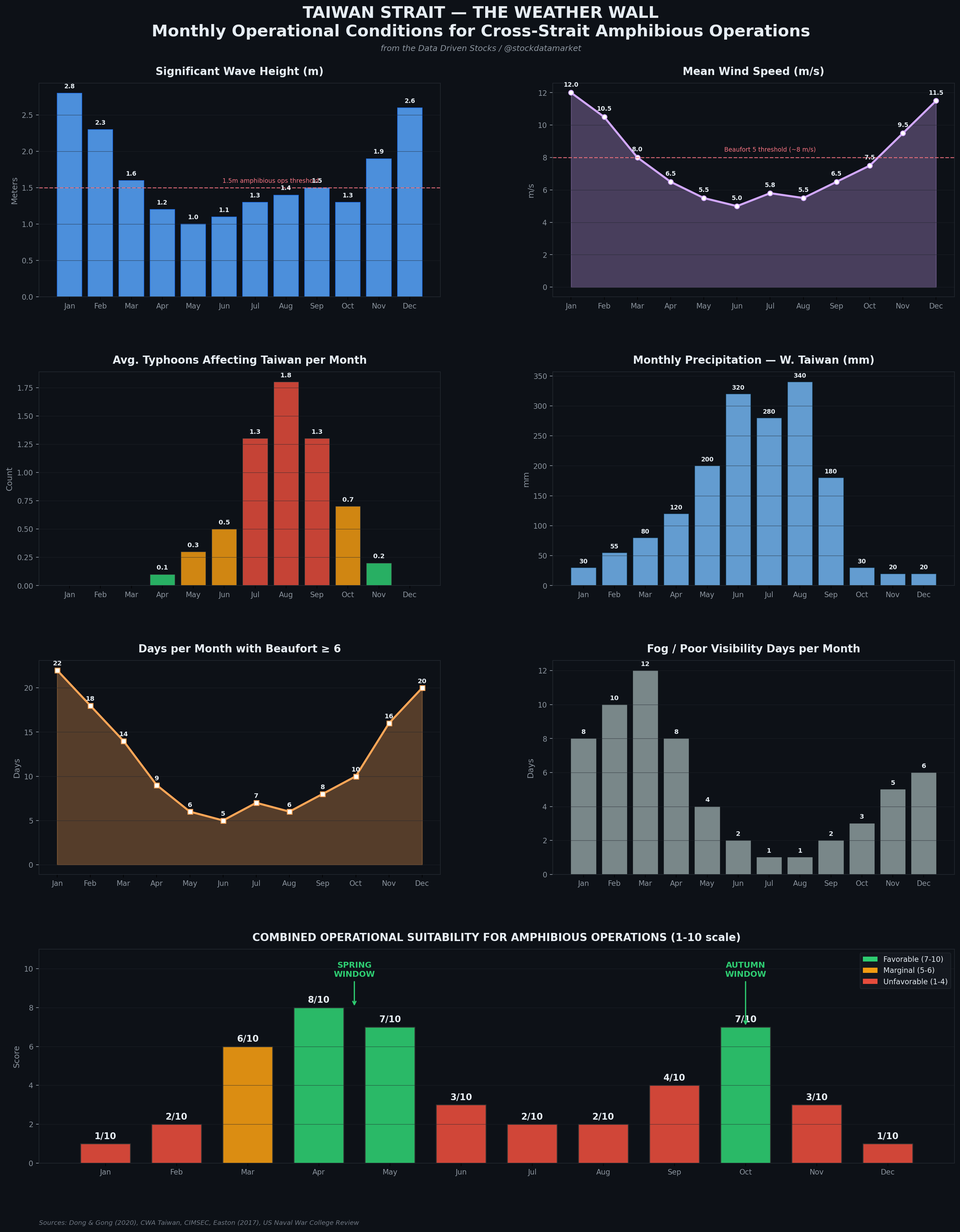 Ian Easton, in his extensively researched book The Chinese Invasion Threat, identified what the data confirms: the Taiwan Strait offers only two months of “good suitability” for cross-strait amphibious operations — April and October. A US Naval War College report expanded this slightly, identifying the windows as roughly May through July and October, though the summer months carry significant typhoon risk that arguably makes them marginal at best.