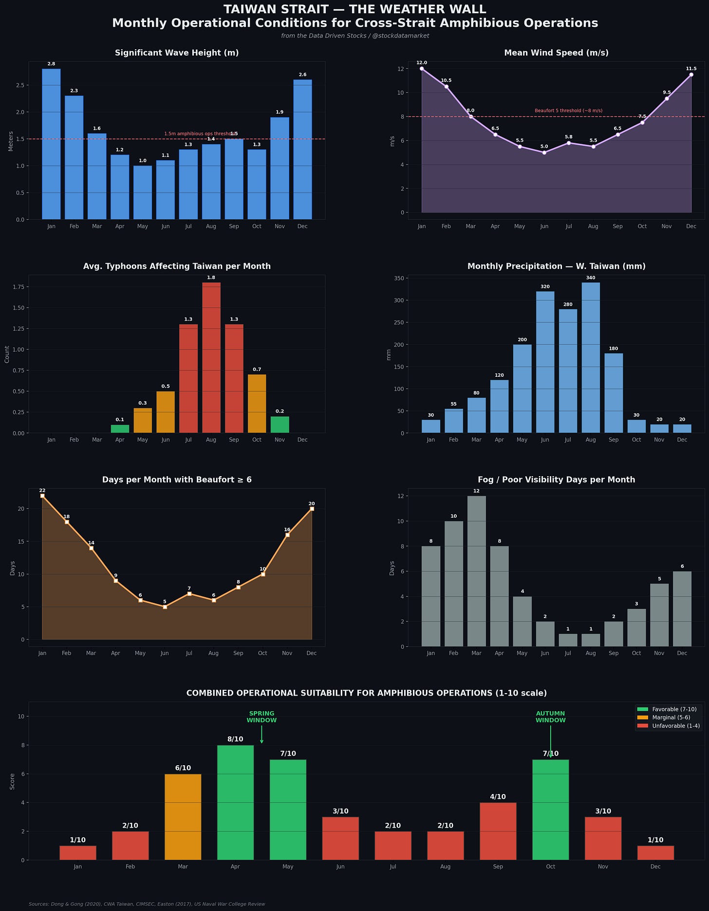 The Taiwan Strait logs Beaufort 6 or higher conditions on an estimated 22 days in January, 18 days in February, and 20 days in December. That’s effectively two-thirds of winter days where the sea state alone would prevent landing operations. The numbers drop dramatically in the spring transition: April sees roughly 9 days at Beaufort 6+, and May only about 6 days. Summer months hover around 5-7 days, but these are typically clustered around typhoon passages rather than distributed evenly.