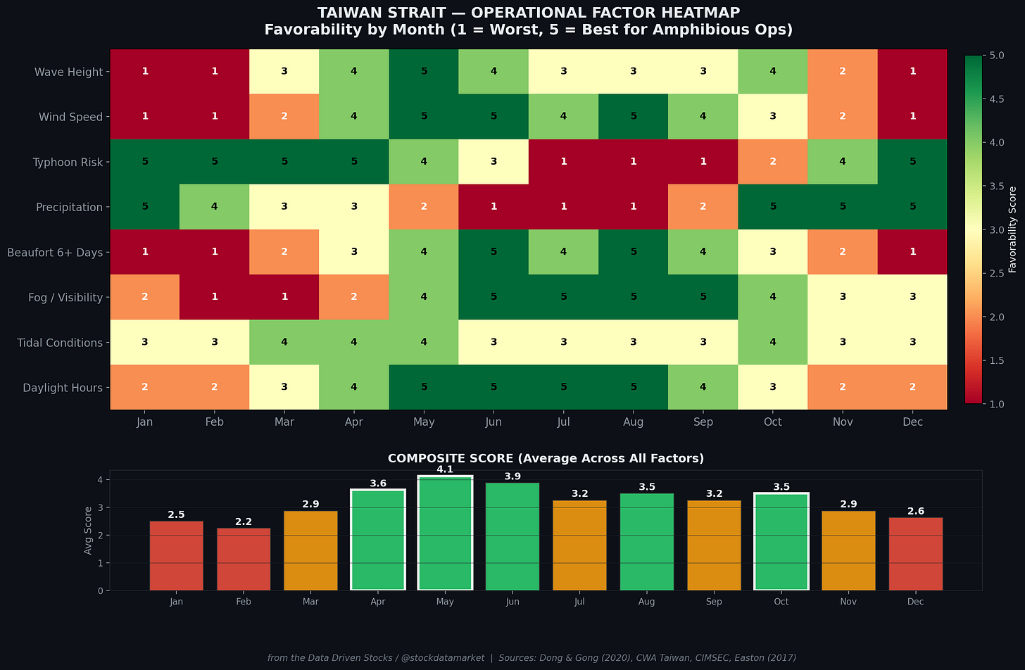 When you overlay every variable — wave height, wind speed, typhoon frequency, precipitation, Beaufort conditions, fog, tidal patterns, and daylight hours — the picture resolves into a remarkably narrow operational calendar. April scores highest across the composite of all factors: seas are calming after the NE monsoon, typhoon season hasn’t begun, fog is diminishing, rainfall is moderate, and daylight hours are increasing. May is nearly as good on most measures, though the leading edge of typhoon risk begins to appear.