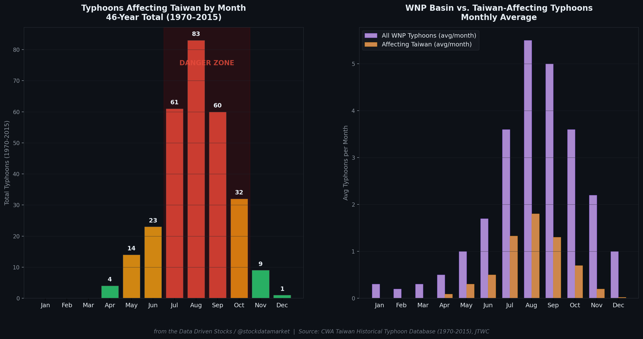 If the monsoons define the broad seasonal patterns, typhoons represent the acute, catastrophic risk. Taiwan sits squarely in the path of Western North Pacific tropical cyclones, and the historical record is emphatic about which months are off-limits.