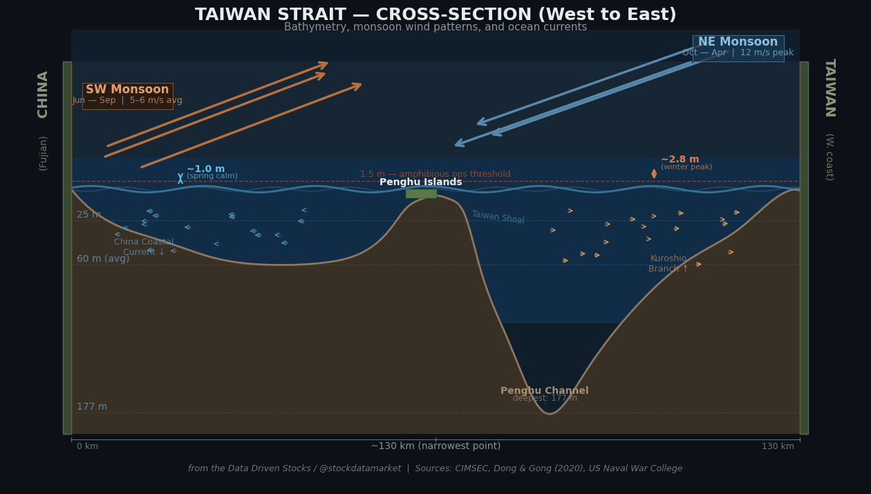 Sailors have called the Taiwan Strait the “Black Ditch” for centuries, and they didn’t mean it as a compliment. Stretching roughly 180 kilometers from northeast to southwest, with an average width of about 130 km at the narrowest point, the Strait sits at the intersection of two massive weather systems that take turns punishing it year-round. The average depth is around 60 meters, though the Penghu Channel plunges to 177 meters while the Taiwan Shoal in the south is barely 25 meters deep. This irregular bathymetry amplifies wave action and creates unpredictable currents that would complicate any large-scale naval movement.