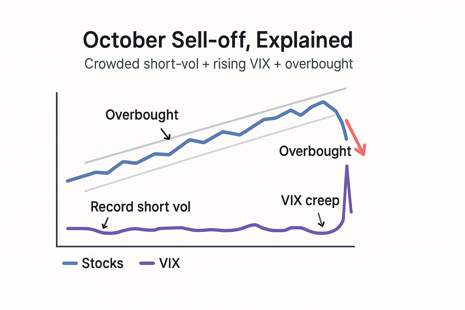 A crowded short in VIX futures, a rare “VIX up while stocks up” divergence, and an overbought S&P 500 set the stage for October’s shakeout. Whether we get another leg down hinges on whether VIX holds.