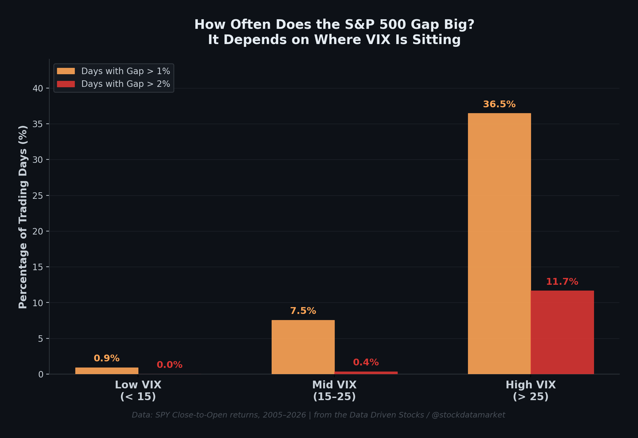 This distinction matters because gap ups and gap downs behave differently depending on the VIX regime. A gap down in a low-VIX world is a very different animal than a gap down when VIX is screaming above 30. Same with gap ups, a relief gap up after a high-VIX selloff carries entirely different follow-through characteristics than a gap up in a calm, grinding bull market.