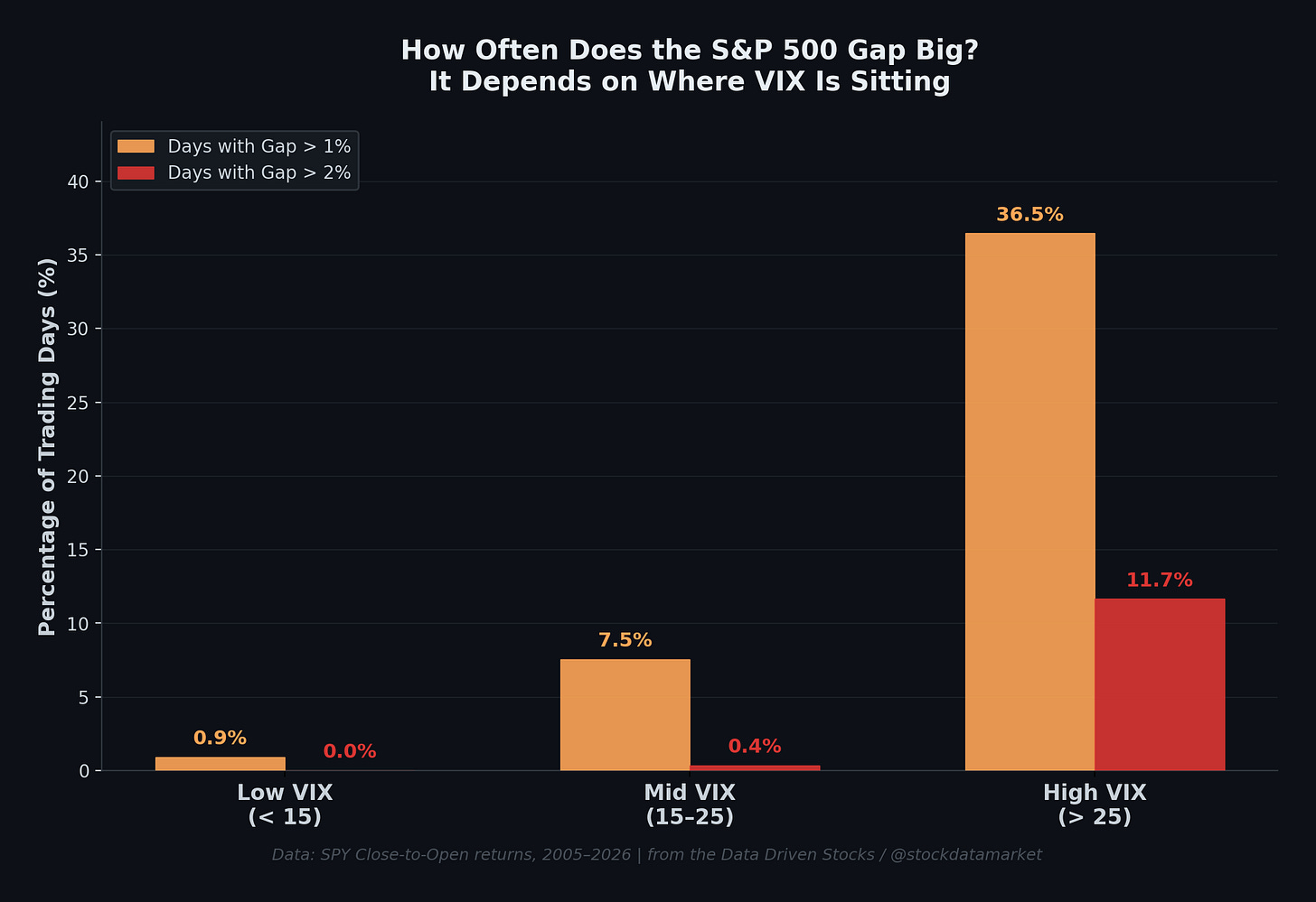 The S&P 500’s gap behavior - whether it gaps up, gaps down, or barely gaps at all - is not random. It’s a direct function of where VIX is sitting and what that implies about dealer gamma positioning. Below VIX 15, the market is a calm pool where gaps are tiny and get filled fast. Between 15 and 25, the system is transitional and you need to watch gamma closely. Above 25, you’re in a world where overnight gaps regularly exceed 1%, where intraday momentum replaces mean reversion, and where the close can be the most violent part of the day.