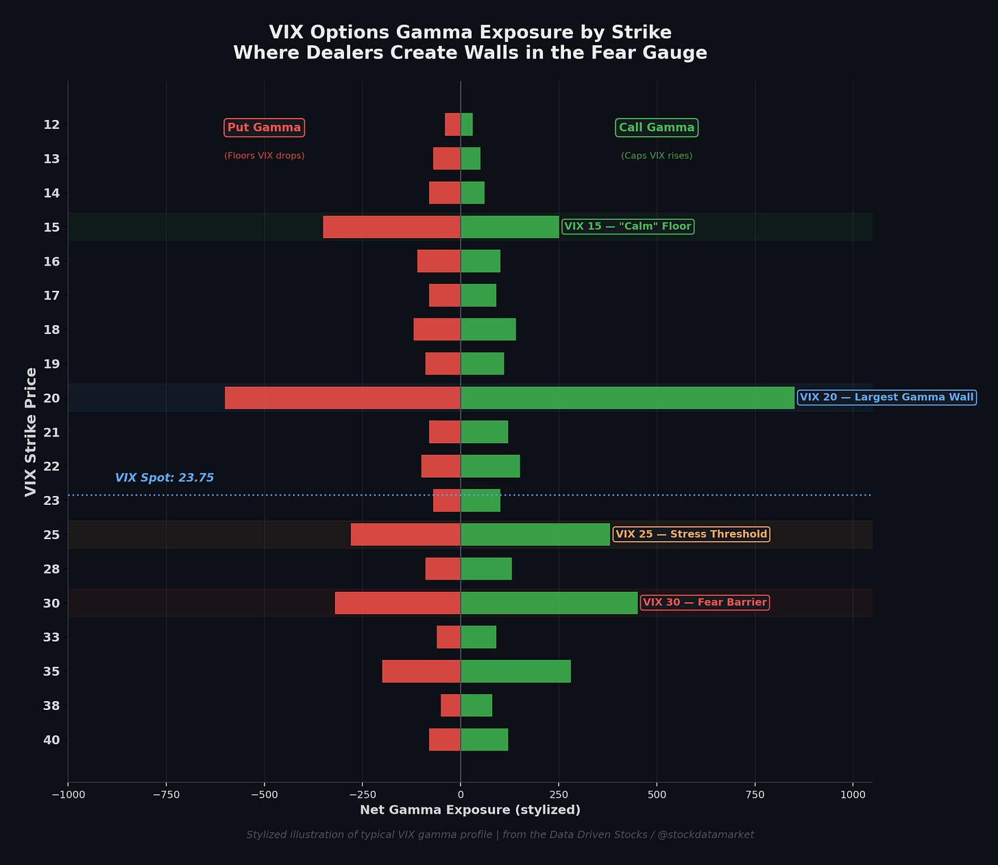Here’s something most people don’t think about: just like the S&P 500 has gamma exposure profiles at different strike levels (you’ve probably seen those horizontal bar charts from SpotGamma or Unusual Whales), the VIX itself is a massive options market with its own gamma walls at key strike prices.