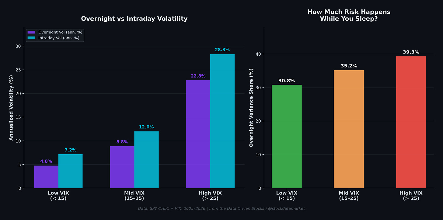 Scenario 2: VIX Recovers (Falls) in the Middle of the Session. This is the “grinder” recovery. The open might have been ugly, maybe a gap down with VIX elevated - but during midday something stabilizes. Perhaps the options market starts seeing sellers of puts rather than buyers. VIX starts to leak lower. When this happens between 11 AM and 2 PM, it often sets up a positive close because the late-day hedging flows shift from amplifying (negative gamma, selling into weakness) to dampening (moving toward positive gamma territory). The overnight variance share - the amount of total daily risk that occurs outside regular hours - runs about 31% in low VIX and 39% in high VIX, so a midday VIX decline also signals that the next morning’s gap risk is declining.