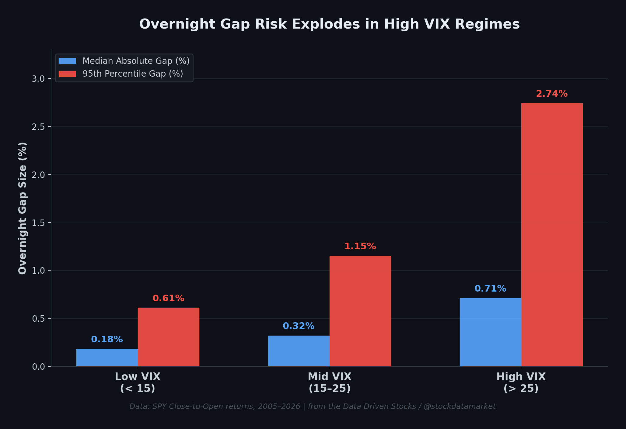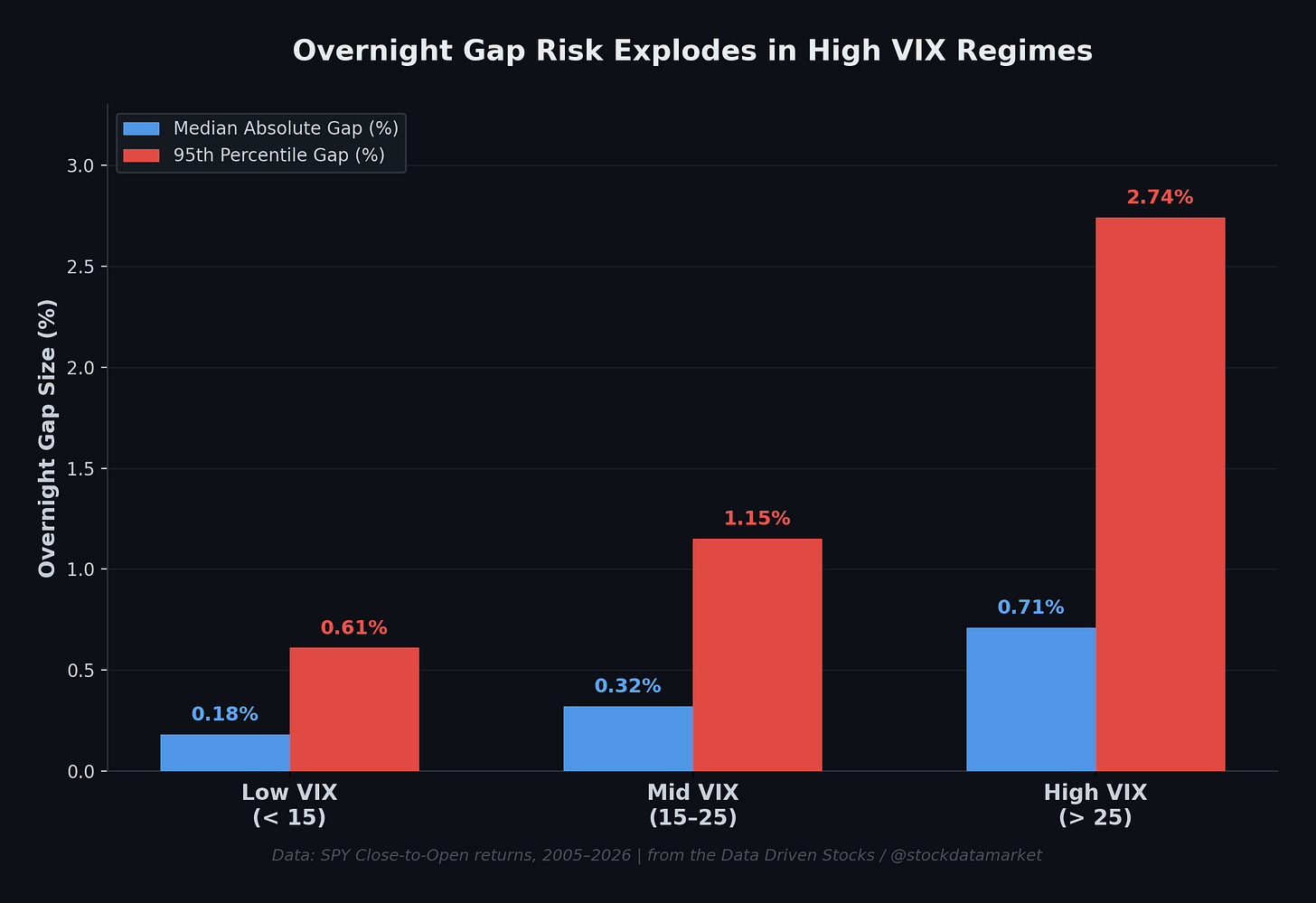 Using data from 2005 through early 2026, over 5,200 trading days, the numbers paint a vivid picture. When VIX sits below 15 (what we’d call the “calm zone”), the median overnight gap is a mere 0.18%. That’s nothing. You barely notice it. The 95th percentile worst-case gap in this regime is just 0.61%, and fewer than 1% of all low-VIX days see a gap exceeding 1%. Gaps above 2% simply don’t happen. The market opens roughly where it closed, day after day after day.
