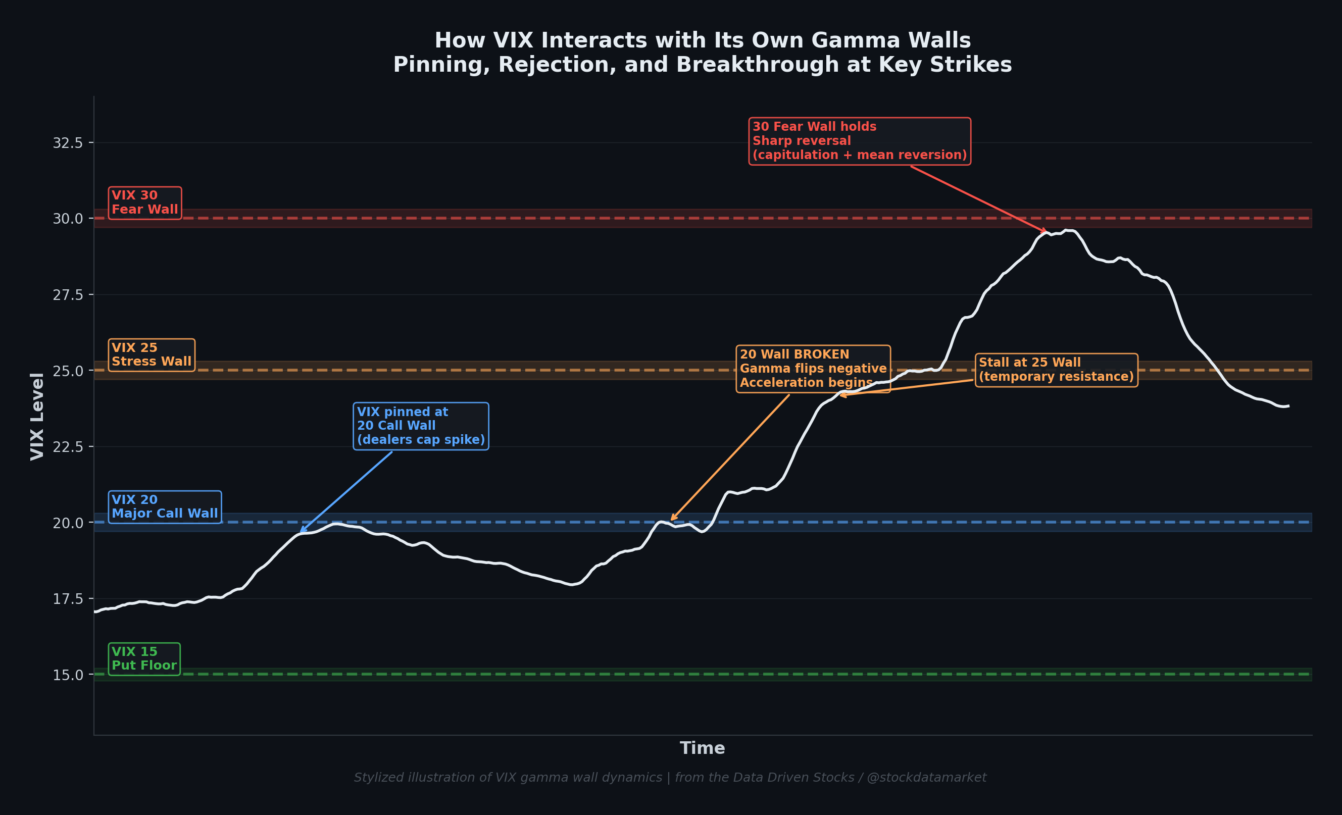 But when the 20 wall breaks — when VIX punches through 20 with conviction, driven by a genuine fear catalyst — the gamma dynamics flip. Dealers who were short calls at 20 now need to buy VIX aggressively to hedge their suddenly in-the-money positions. Their hedging no longer caps VIX; it accelerates it. This is the gamma-driven “breakout” that practitioners talk about — once the biggest wall is breached, the path clears for a rapid acceleration toward the next wall.
