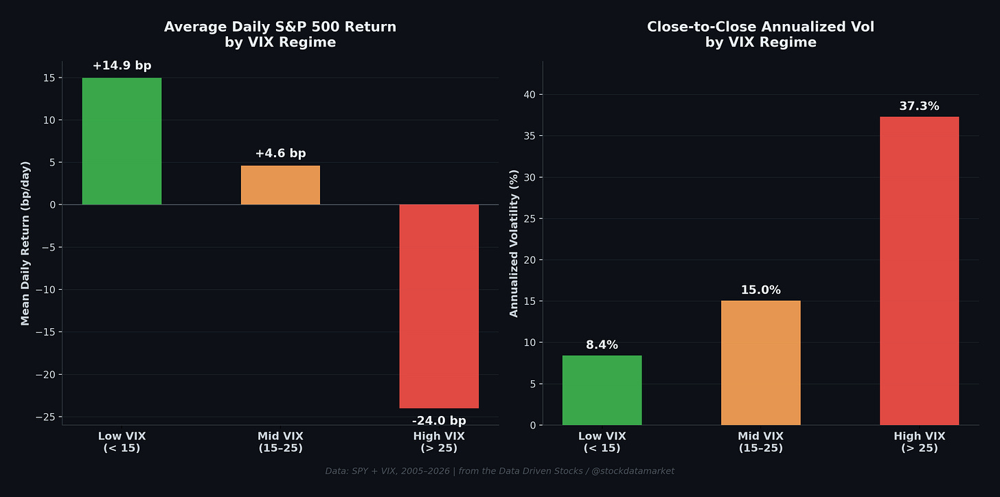 Below VIX 15 is the calm zone where dealers are overwhelmingly long gamma. Their hedging flows create a natural ceiling and floor for the market. Gaps tend to be tiny, and when they do occur, they get filled quickly during the session as dealers buy dips and sell rips. The market grinds, it doesn’t jump. Mean reversion is the dominant force, and “buying the dip” feels like free money (which, to be fair, it kind of is in this regime — the average daily S&P return runs around +15 basis points per day).